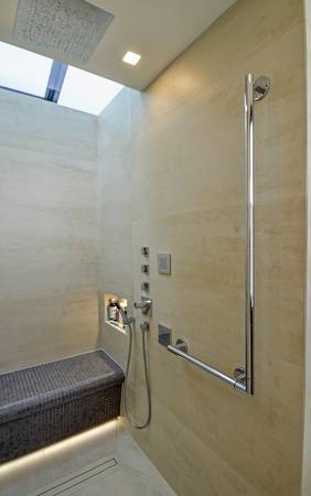 Auf Wunsch kann ein Sitz einfach eingehängt oder aber auch später nachgerüstet werden. Reling-Stangen in variablen Größen können passend kombiniert werden, um als Griff oder Handtuchhalterung zu dienen – oder eben beides. Wenn gemauerte Sitze als Block ausgearbeitet und mit dem Bodenmaterial bekleidet werden, dann sollte auf jeden Fall eine Unterleuchte integriert werden. Es sieht nicht nur schick aus, sondern es ist für den ein oder anderen auch eine notwendige optische Maßnahme, um die Konturen von Sitz und Boden zu erkennen. Kontraste sind nicht nur eine Belebung der Raumgestaltung – bei der Komfortbadplanung ist es eine wichtige Zutat, um Menschen mit Sehschwäche eine sicherere Nutzung zu ermöglichen.