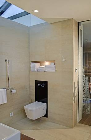 Die funktioniert wie die Dunstabzugshaube in der Küche – die Gerüche gelangen erst gar nicht in den Raum, sondern werden direkt über einen Aktivkohlefilter geleitet und die saubere Luft wird dann erst in den Raum abgegeben. Auch in den Wannenbädern ist ein Element mit Geruchsabsaugung verwendet worden.
