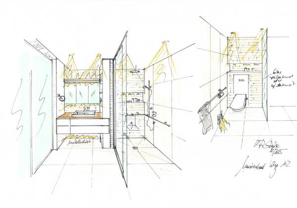 Im Beispiel von Bensberg ist in einem Bad der Sichtschutz der WC-Einheit durch eine satinierte oder teilsatinierte Glasscheibe angedacht worden. Notwendig geworden gerade durch die offene Gestaltung der Raumfluchten und dem direkten Zugang vom Schlafzimmer zum Bad. In gleicher Flucht mit der Duschabtrennung passt das sehr schön zur Gestaltung und dem Fugenschnitt. Zudem könnte die Glaswand zur Dusche mit einer Schiebetür ergänzt werden und mit der feststehenden Wand am WC zusammen den gesamten rechten Bereich schließen.