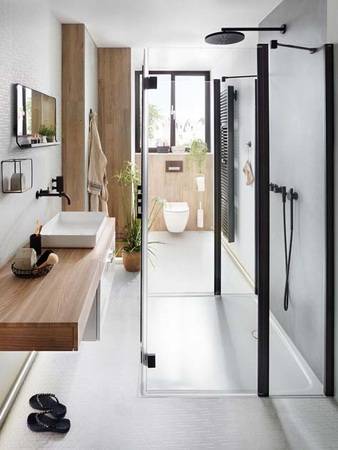 Für die Gestaltung eines schmalen oder engen Badezimmers ist zum einen die richtige Anordnung wichtig, aber auch die Wahl der passenden Produkte. Die Duschlösung von Kermi Liga Pendel-Falt U-Form, ist ein echtes Platzwunder. Im ausgefalteten Zustand ist sie ein praktischer Spritzschutz, egal ob sie direkt am Fenster, einer Vormauerung oder wie in diesem Beispiel an der freien Wand montiert wird.