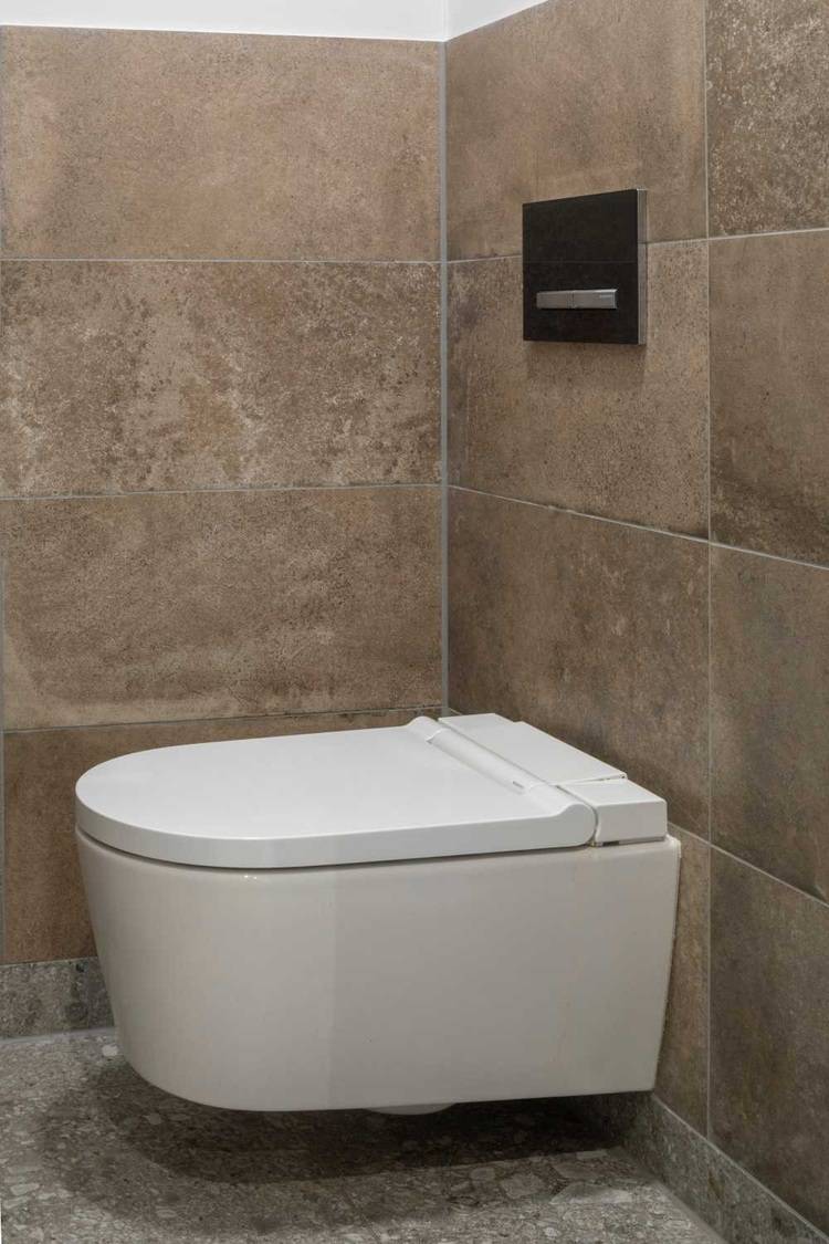 Nachdem die Installationsarbeiten hinter der Wand abgeschlossen waren, verlief der restliche Einbau der Dusch-WCs schnell und einfach. Die Verpackung der Geberit AquaClean-WCs dient dem Installateur als Montagehilfe. Sie stützt die WC-Keramik, so dass diese ohne großen Kraftaufwand in der richtigen Höhe befestigt werden kann. Die Technikeinheit kann anschließend in einem Stück von oben in die Keramik eingesetzt und ebenso einfach wieder entfernt werden. Das erleichtert auch die Wartung.