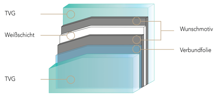 Mit Verbundsicherheitsglas wird eine frei stehende Dusche noch stabiler und robuster. SPRISAFE Verbundsicherheitsglas von Sprinz besteht aus zwei Glasscheiben, die mit einer reißfesten, wasserabweisenden Folie fest verbunden sind. Der UV-Digitaldruck befindet sich zwischen den zwei Scheiben und ist so geschützt. Für hohen Sichtschutz sorgt eine Deckschicht in weißer Farbe. Links und rechts dieser Weißschicht wird das Motiv gedruckt. Die hohe Deckkraft der Weißschicht sorgt für besonders brillante Farben und hohen Sichtschutz.