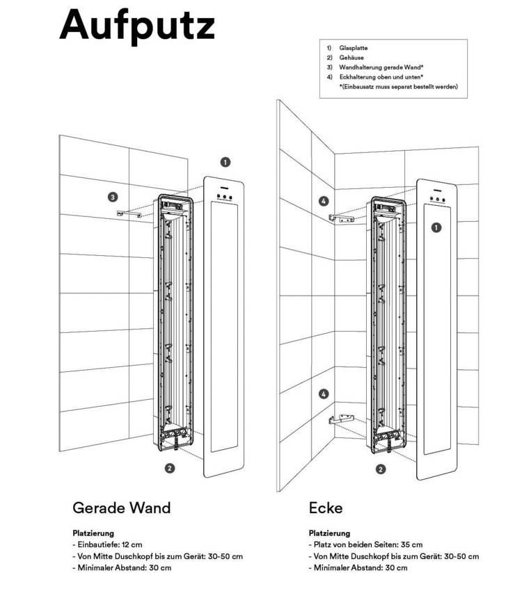 Um das Gerät unter Putz einzubauen, muss zunächst entsprechend der Größe der Installationsbox eine Aussparung in der Wand angelegt werden. Die Unterseite der Aussparung sollte mindestens 30 kg tragen können. Dann wird das Stromkabel in die Installationsbox gelegt. Für eine Sunshower ist ein separater Stromanschluss erforderlich und es wird ein FI-Schutzschalter, 230 V/50 Hz mit 16-A-Sicherung