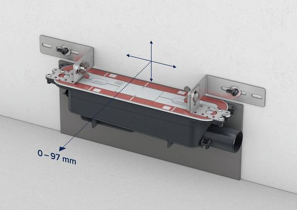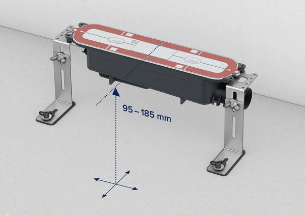 Da keine Montagefüße im Weg sind, gelingt auch die Unterfütterung des Ablaufs mit Estrich leichter und Installationsrohre können unter dem Ablauf hergeführt werden. Praktisch ist zudem, dass der Halter bei der Wandmontage nach dem Einbringen des Estrichs demontiert und wiederverwendet werden kann, bei der Bodenmontage verbleibt er einfach im Estrich.