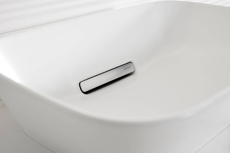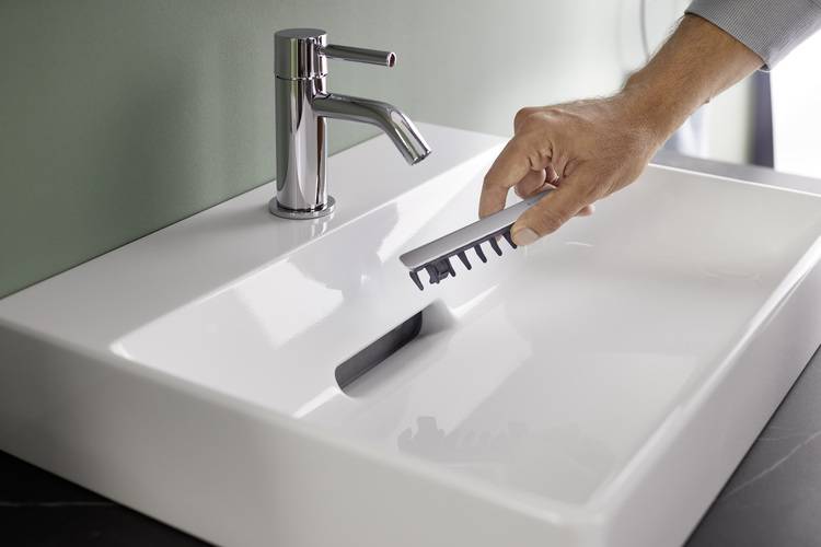 Sehen wir uns beispielsweise das Waschbecken hier an (Geberit ONE mit einem horizontalen CleanDrain Ablauf): Normalerweise hätten wir in der Mitte einen runden Siphon, aus dem ich dann regelmäßig die langen Haare meiner Töchter herausholen muss. Das macht natürlich überhaupt keinen Spaß. Der CleanDrain Ablauf von Geberit hat an der Rückseite einen Kamm, er ist magnetisch, ganz leicht rauszunehmen, ganz leicht zu reinigen. In anderen Waschbecken haben wir dann noch diesen Überlauf, bei dem man gar nicht wissen will, wie es dahinter aussieht. Dieses Waschbecken hat auch eine Überlauffunktion, aber sie ist unsichtbar versteckt. Das sind keine Dinge, die im Showroom den großen Wow-Effekt auslösen. Aber im täglichen Leben machen sie einen riesigen Unterschied.