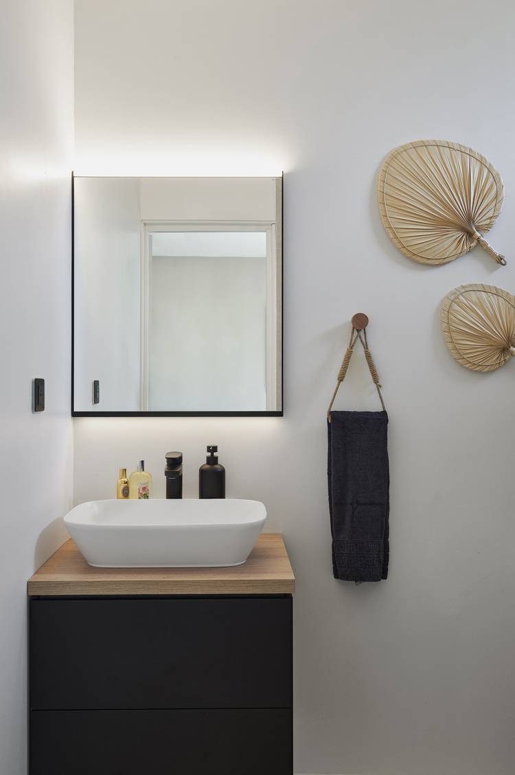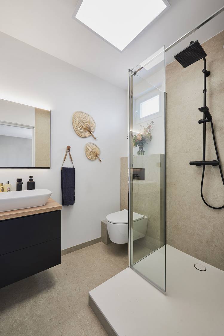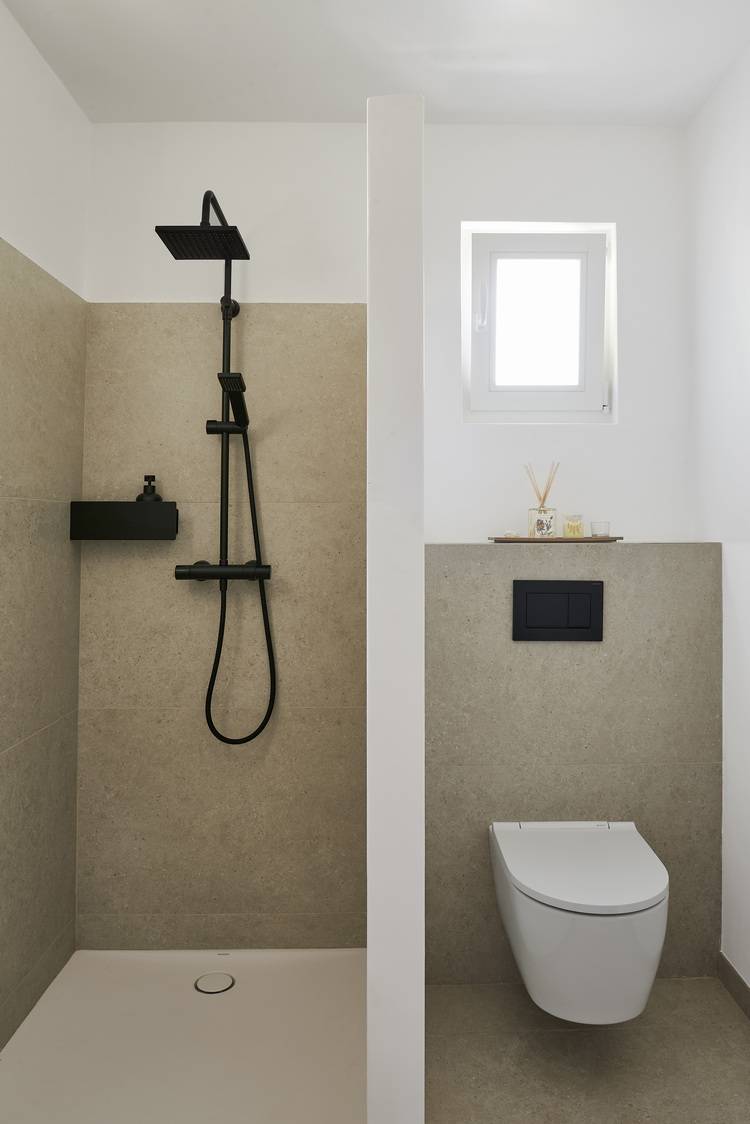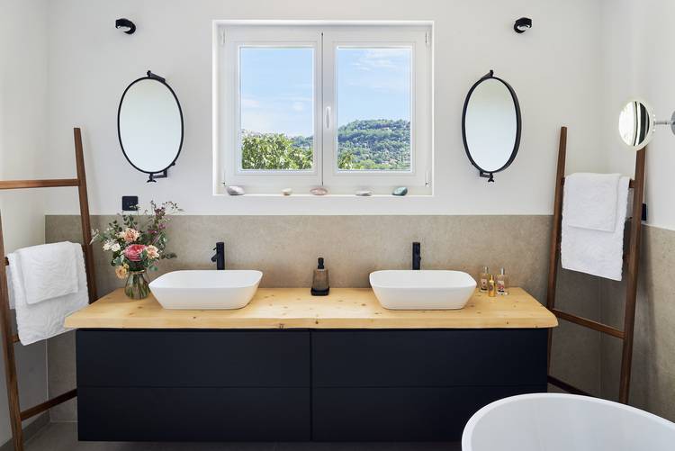 Passend zum Boho-Look fügen sich die schwarz matten Geberit ONE Unterschränke in Kombination mit der Waschtischplatte im eleganten schlichten Eiche-Farbton zusammen mit der weißen Keramik harmonisch in die natürliche Umgebung ein. Der Geberit ONE Waschtisch überzeugt mit seiner Ästhetik und Funktionalität. Sein horizontaler Ablauf ist ein Blickfang im Bad und besitzt eine elegante Ablaufblende mit Kammeinsatz, die einfach zu entnehmen und zu reinigen ist. Die ONE Waschtischunterschränke haben keinen Siphonausschnitt in der oberen Schublade und bieten dadurch deutlich mehr Stauraum. Für das Hauptbad wurden die ONE Möbel für einen rustikalen Look mit einer sägerauen Platte in Eiche vom Schreiner kombiniert.