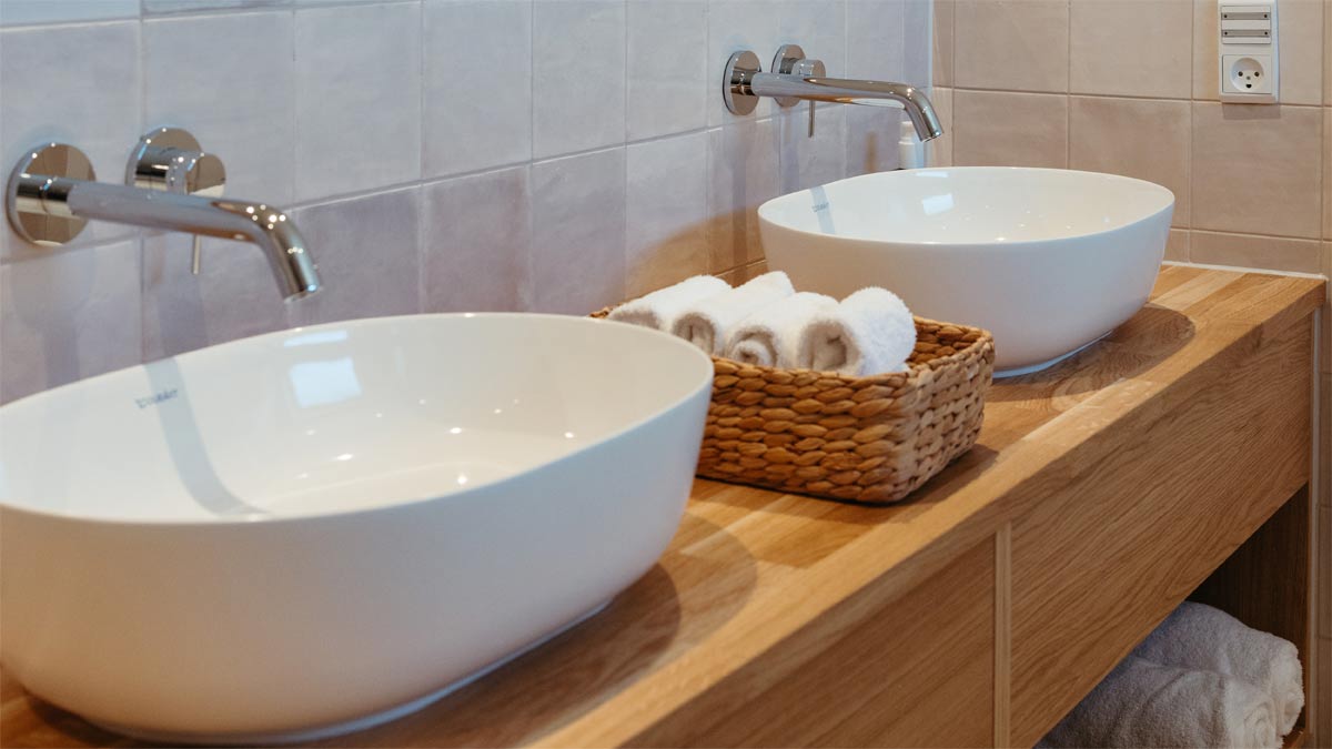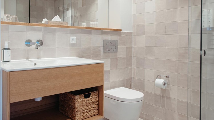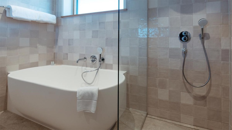Helle Natursteinfliesen in Greige- und Sandtönen bilden die Grundlage, warme Holzoberflächen und weiße Keramik schaffen eine warme Balance. Badewannen und Aufsatzwaschbecken der Serie Luv unterstreichen den skandinavischen Charakter und verbinden klare Formen mit wohnlicher Wärme. Ergänzend fügen sich die wandmontierten WCs und Möbelwaschtische der Serie ME by Starck nahtlos ein. Das puristische Design wirkt leicht und elegant, während die hochwertigen Materialien ihre Form und Funktion auch bei hoher Beanspruchung im Hotelbetrieb dauerhaft bewahren.