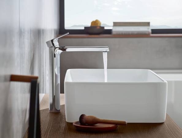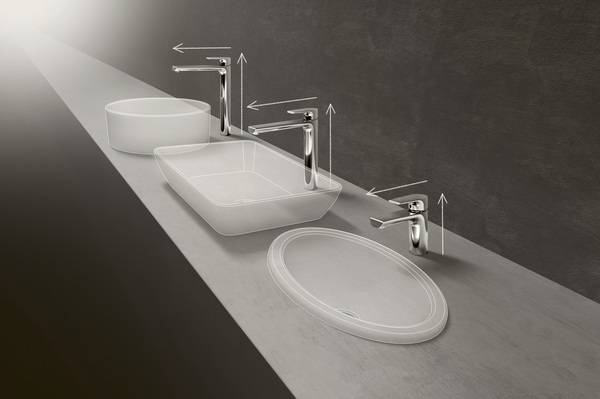 Zur Wahl stehen zwei schlanke Standarmaturen mit geradem Auslauf und schmalem Einhandhebel: Die niedrige Version ist ideal für Wand-, Ein- oder Unterbauwaschtische, die hohe Variante ist auf die Aufsatzwaschtische abgestimmt. Im gleichen Design gibt es zudem eine Wandauslaufarmatur, die mit einem Aufsatzwaschtisch kombiniert werden kann, und einen Badewanneneinlauf.
