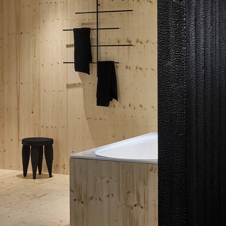 Ein charakterstarkes Detail ist die Fassade des Pavillons aus schwarzgebranntem Holz in traditioneller Suyaki-Technik, mit der in Japan Häuser konserviert werden. Die auch „Alligatorhaut“ genannte, verkohlte Rußschicht ist robust, wasserabweisend, feuerhemmend, UV-beständig und farblanglebig – ganz so wie die hochwertige BetteGlasur, die Badewanne, Duschfläche und Waschtisch glatt und glänzend umschmeichelt. Zu sehen im Showroom von Bette am Unternehmenssitz in Delbrück.