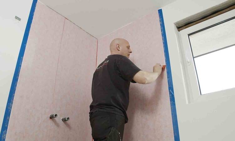 Aufgrund der eigens für HSK entworfenen, selbstklebenden Dichtbahn mit gesättigtem Vlies kann die RenoDeco Dekorplatte zuverlässig mit einem Montagekleber auf der abgedichteten Wand angebracht werden. Wichtig hierbei: Die Plattenmontage ist ausschließlich mit dem Montage-Kit oder 1K-Klebstoff möglich, nicht aber mit Fliesenkleber oder Dichtschlämmen.