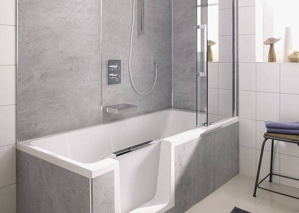 Ein Beispiel ist hier die Dobla von HSK: Die Wannentür wird einfach aus ihrer Parkposition am Wannenrand herausgenommen und in die Türöffnung eingesetzt. Integrierte Magnete sorgen für eine sichere Abdichtung. Wird die Wannentür einmal vergessen, verhindert ein Überlaufschutz die Überschwemmung des Bades.