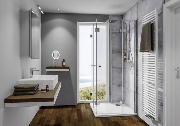 Entscheidet sich der Nutzer „nur“ für eine Dusche, kann der Fachhandwerker durch verschiedene Duschtüren eine Bandbreite von Möglichkeiten für kleine Bäder präsentieren. So verschenken Drehfalt-, Schiebe- und Pendeltüren keinen Platz im Badezimmer.
