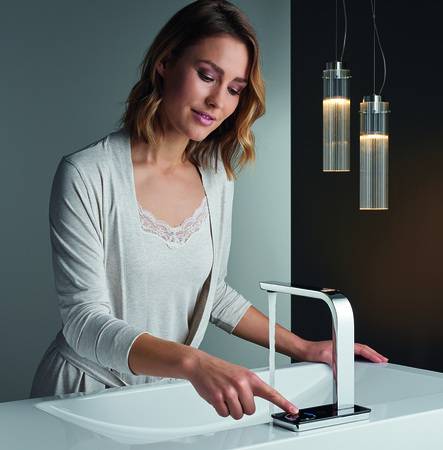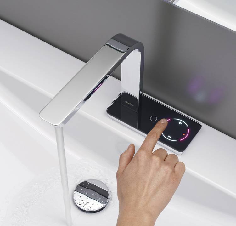 Die elektronische Waschtischarmatur WimTec Ocean E10 hat eine homogene Glasoberfläche in Weiß oder Schwarz. Per Fingertipp startet der Wasserfluss und die AquaCap-Sensortasten beginnen zu leuchten. Diese visualisieren von blau über violett bis rot die gewählte Wassertemperatur. Die Temperatur und Durchflussmenge können schrittweise durch Tippen oder im Schnelllauf durch Halten der Sensortasten reguliert werden. Dank Memory-Funktion fließt das Wasser beim Einschalten mit der zuletzt eingestellten Temperatur und Durchflussmenge oder auf Wunsch mit einer fixen individuellen Einstellung. Darüber hinaus sichert die intelligente Freispül-Automatik durch Spülen der Warm- und Kaltwasserleitung die Wasserqualität. Eine einstellbare Heißwasserbegrenzung sowie Heißwasserwarnung sorgen für zusätzliche Sicherheit.