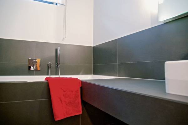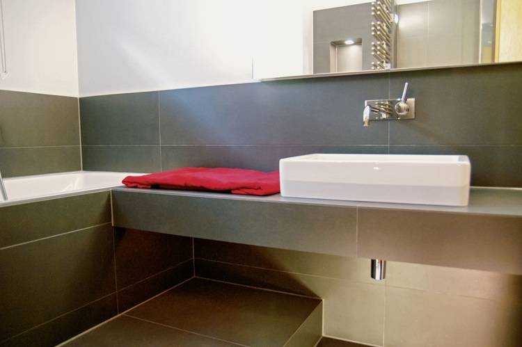 Durch diese zweite Ebene wird die Badewanne optisch in den Boden versenkt. Die durchgehende Ablageplatte unter dem Aufsatzwaschtisch erhält so die perfekte Sitzhöhe neben der Badewanne – behält aber ihre benötigte Ablagehöhe im Waschtischbereich bei. Damit die Oberkanten von Badewanne und Sitztableau übereinstimmen, wird die Wanne etwas höher eingebaut – so entsteht eine dritte Ebene.