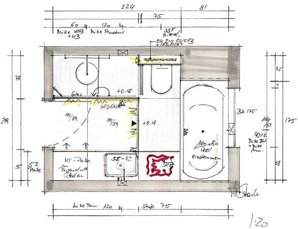Wegen des Raumzuschnitts ist die Badewanne unterhalb des Fensters in der Nische platziert. Geringfügige Stemmarbeiten verbreitern die Nische für die Installierung des Whirlpools. Der Waschtisch befindet sich an der rechten Seite des Raumes und zieht den Blick beim Betreten auf sich. Da es sich um ein gemietetes Einfamilienhaus handelt, soll die Tür nicht versetzt werden, um das Raumbild im Flur nicht zu verändern.