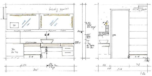Abrunden lässt sich die Ausführung noch mittels eines zusätzlichen Leuchtspiegels. Er soll nicht nur die Waschtischwand in der kompletten Länge verkleiden, sondern auch einen Fernseher beinhalten. Dabei handelt es sich um einen Wunsch des Bauherrn – Fernsehen in der Badewanne.