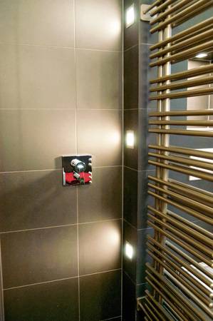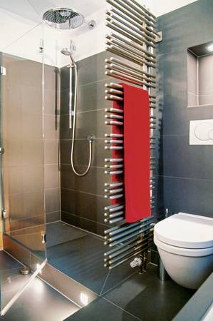 Die Abtrennung des Duschbereichs bildet eine feststehende Glasscheibe mit einer angehängten Pendelglastür, die nach innen und außen geöffnet werden kann. Den Spritzschutz zum WC gewährt der Heizkörper. Als Raumteiler hält er die Handtücher angewärmt an der richtigen Stelle bereit und sorgt auch für Intimsphäre im WC-Bereich.
