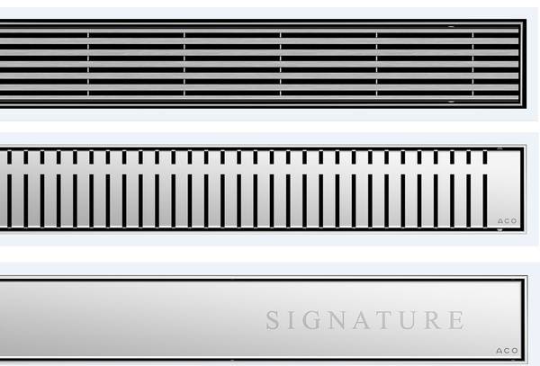 Mit den Design-Rosten Linea, Piano und Signature verleiht ACO Haustechnik der ShowerDrain neue Individualisierungsoptionen. Das Rostdesign von Linea ist schnörkellos mit 7 Streben und 6 durchgängigen Ablaufschlitzen längs der Duschrinne. Bei Piano hingegen stehen die Ablaufschlitze in zwei Reihen (mit zwei Schlitzlängen, Größenverhältnis etwa 4 zu 1) im rechten Winkel zur Breitseite der Rinne.