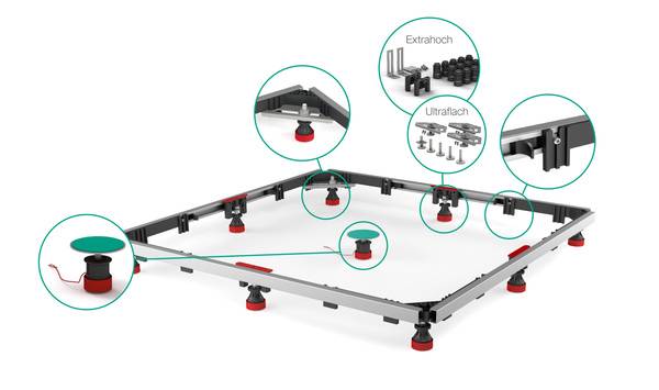 Die Montagerahmen sind standardmäßig bei Einbauhöhen von 65 mm bis 190 mm einsetzbar. Mit den Erweiterungs-Sets Ultraflach und Extrahoch kann der Installateur eine Mindesteinbauhöhe von 55 mm bzw. eine Maximalbauhöhe von 230 mm realisieren. Mit dem als Zubehör angebotenen Erweiterungs-Set Ecktraverse erhält der Installateur neben der serienmäßig im Lieferumfang der Montagerahmen erhältlichen Ecktraverse noch eine zweite.