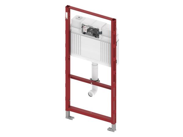 Die niedrigere Sitzhöhe eines Kinder-Stand-WCs erfordert eine niedrigere Anschlusshöhe, was den Montageaufwand mit Standardprodukten erhöht. Speziell für WCs in kindgerechter Bauhöhe hat TECE ein Vorwandmodul entwickelt. Die Bauhöhe des Moduls aus einer selbsttragenden und schallentkoppelten Stahlkonstruktion beträgt 1120 Millimeter. An der untersten Traverse befindet sich eine Lochbohrung um bei Bedarf einer Halteschelle für den Abwasserbogen zu befestigen. Durch weitere Vorbohrungen und Schlitze im Rahmen lässt sich das Modul in eine TECEprofil Wand oder in Metall- und Holzständerwände einbauen.