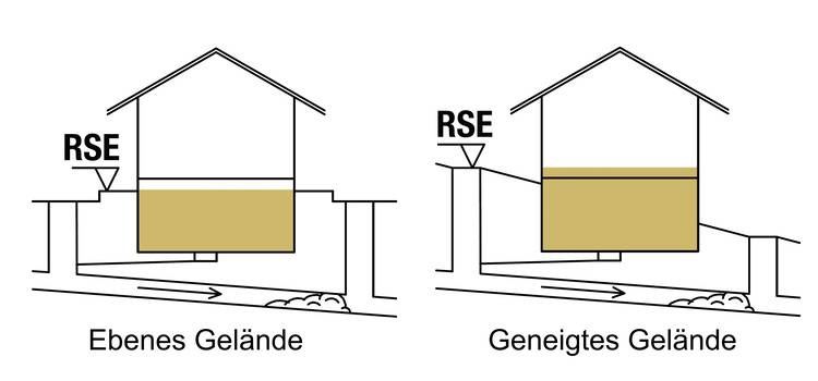 Grundsätzlich kann die RSE für ein Wohnhaus bei der Kommune erfragt werden. Letztlich entbindet diese Auskunft der Kommune aber nicht vor der eigenen Verantwortung zur korrekten Festlegung. Daher gilt: Die RSE befindet sich auf dem Niveau von Straßenoberflächen, Gehwegen oder Seitenstreifen, von wo aus sich rückstauendes Wasser in der Ebene verteilen kann. Im abschüssigen Gelände ist die Oberkante des nächsten Abwasserschachtes relevant. Die Verhältnisse werden in der Skizze 1 dargestellt.
