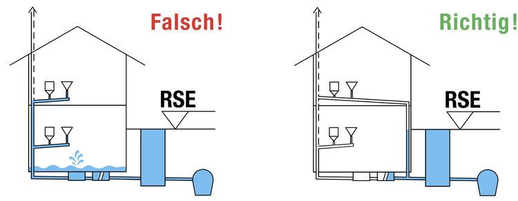Will man einen Rückstauschutz errichten, so neigt man dazu, großzügig zu sein. Ein Schutz, ausgedehnt auf alle Bereiche, kann doch nicht so falsch sein? Das betrifft allerdings keinesfalls den Schutz vor Rückstau. Es gilt ganz klar, dass nur die Ablaufstellen, die unterhalb der RSE liegen, geschützt werden. Ablaufstellen oberhalb der RSE während eines Rückstaus auch zu blockieren ist nicht nur sinnlos, sondern auch kontraproduktiv. Denn diese Ablaufstellen würden ohnehin nicht geflutet, könnten aber während des Rückstaus nicht mehr benutzt werden, weil diese ja dann vom Abwasserkanal abgeschnitten wären.