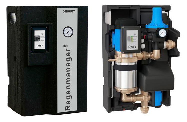 Dehoust hat dem Regenmanager RM3 ein neues Design spendiert und auch unter der Haube sorgen verbesserte Bauteile, wie zum Beispiel ein neuer Druckschalter und ein etwas größerer Trinkwasser-Vorlagebehälter, für noch mehr Betriebssicherheit.