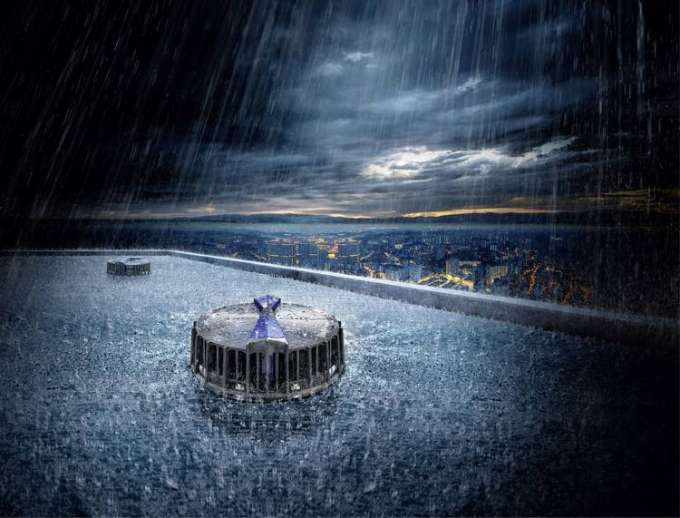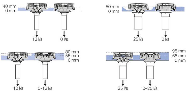 Bei dem Unterdruckdachentwässerungssystem Pluvia von Geberit erfolgt die Notentwässerung über ein separates Leitungssystem. Das System besitzt ein eigens entwickeltes Notüberlaufset, mit dem der Grundkörper des Dachwassereinlaufs zu einem Notüberlauf umgerüstet werden kann. Der Aufwand einer erhöhten Montage der Noteinläufe entfällt damit vollständig. Durch den Einsatz des Notüberlaufsets wird das Niederschlagswasser auf dem Dach, je nach System (12 l oder 25 l) zwischen 55 und 65 mm hoch angestaut, bis der Notüberlauf in Betrieb geht. Dann sorgt die Notentwässerung zusammen mit dem Hauptentwässerungssystem für eine Ablaufleistung von bis zu 24 l/s in Verbindung mit dem 12-l-System, alternativ von bis zu 50 l/s mit dem 25-l-System.