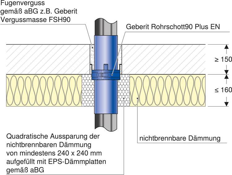Wird die Rohrmanschette teilweise eingelassen, wird sie abhängig von der Dimension mindestens 1 cm tief eingelassen montiert. Das Rohrschott kann bis maximal decken- bzw. wandbündig, je nach Bausituation, vollständig eingelassen montiert werden. Dabei erfolgt die Befestigung der Manschetten über den umlaufenden Verschluss der Bauteilöffnung mit formbeständigen, nichtbrennbaren Baustoffen, wie z. B. Beton, Zementmörtel oder Gipsmörtel, über die rechtwinklig abgebogenen Befestigungslaschen. In Decken kann wahlweise der Fugenverschluss durch die Geberit Vergussmasse FHS90 erfolgen.