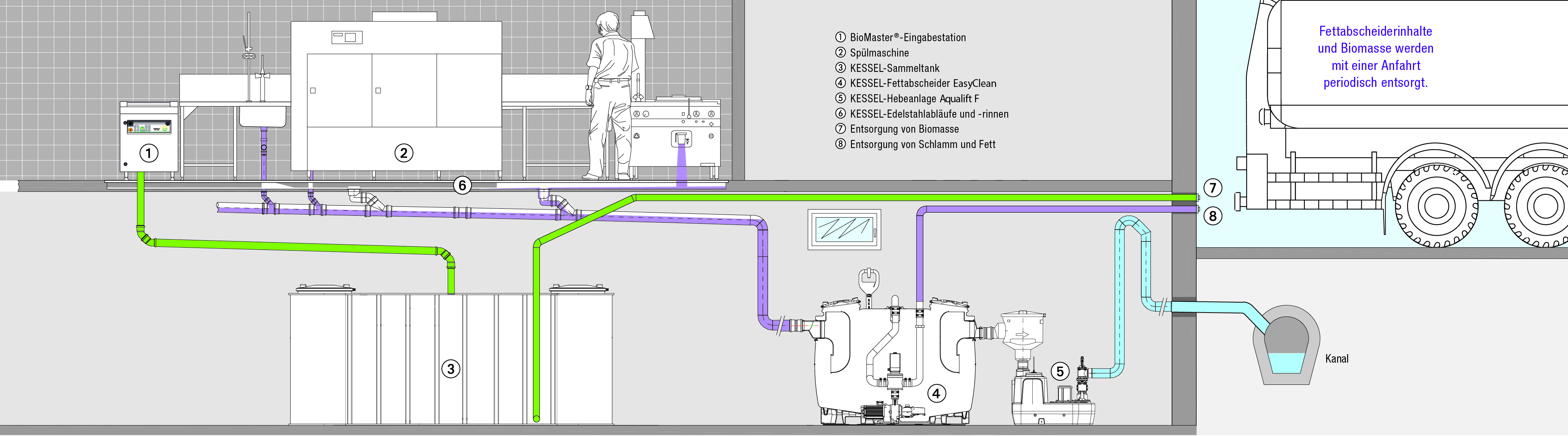 In Restaurants und Großküchen entstehen nicht nur köstliche Speisen, es fallen auch große Mengen an Abfällen und fetthaltigem Abwasser an. Mit den zwei Systemkomponenten, bestehend aus der Eingabestation BioMaster für Küchenabfälle und Speisereste und dem Fettabscheider EasyClean, bieten BioTrans und Kessel eine clevere Lösung für eine unkomplizierte und geruchsfreie Entsorgung.