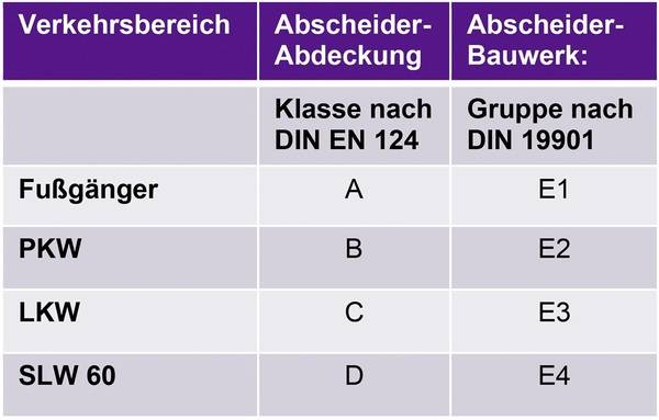 Seit Dezember 2012 gibt es eine klare und einheitliche Norm DIN 19901, welche für alle Bauformen und Werkstoffe gilt. Diesen Nachweis der Tragfähigkeit und Gebrauchstauglichkeit verlangt nun auch die im Dezember 2016 erschienene Neuausgabe der DIN 4040-100, deren Umfang von 20 auf 35 Seiten erhöht wurde. Der Hersteller muss in jedem Einzelfall eine Prüfstatik vorlegen. Alle Beteiligten müssen dann Inhalt und Ergebnis überprüfen. Eine aufwendige Aufgabe, welche im Falle von Zulassungen bisher vom DIBt erfolgte. Neu ist für den Anwender auch, dass es neben den aus der DIN 124 bekannten Verkehrslastklassen nun Verkehrslastgruppen gibt, welche für den Abscheider als Bauwerk gelten, nicht aber für die Abdeckung. So kann ein Abscheider mit der Verkehrslastgruppe E2 beispielweise nur im Bereich PKW-Befahrung eingebaut werden. Auch der Austausch der Abdeckung Klasse B mit Klasse D würde dies nicht rechtfertigen (Bild 4).