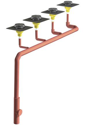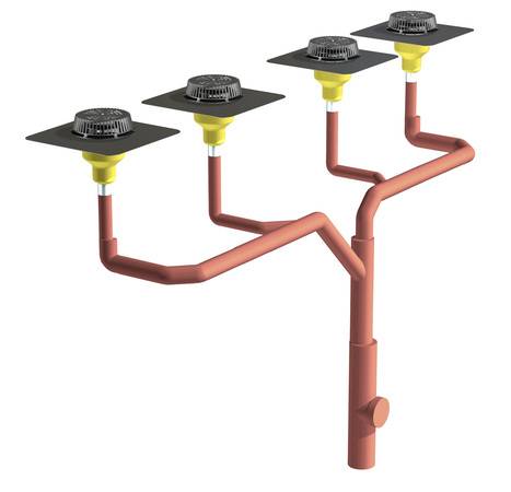 Die Druckverluste müssen also sowohl bei einem langen wie auch bei einem kurzen Fließweg annähernd immer gleich sein. Je länger der Weg ist, den das Wasser zurücklegen muss, desto größer ist bei gleicher Nennweite auch der Druckverlust. Um jedoch die vorgegebenen Bedingungen einhalten zu können, sind bei langen Fließwegen in der Regel größere Rohrnennweiten einzuplanen – ein eigentlich unerwünschter Effekt. Im Idealfall arbeitet die Anlage mit kurzen Fließwegen, die eine effektive Entwässerung mit klein dimensionierten Leitungen ermöglichen. Das Bemühen, kurze Fließwege zu erzielen, sollte deshalb immer im Vordergrund stehen. Eine vergleichende Betrachtung der verschiedenen Leitungsführungen verdeutlicht dies.