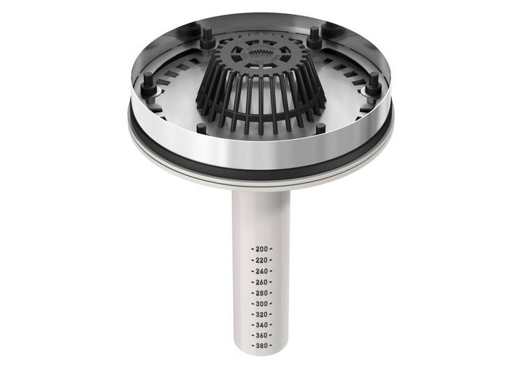 Der Statiker hat eine zusätzliche Last von 150 kg/m² bestätigt. Aus der Tabelle 10 der DIN 1986-100 ergibt sich für die vorgesehenen Dachabläufe DN 100 bei Schwerkraftentwässerung eine Druckhöhe (Stauhöhe) h von 35 mm.