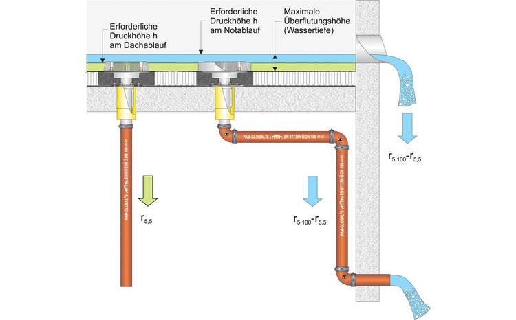 Nach Abschnitt 14.2.6 der DIN 1986-100 müssen das Dachentwässerungs- und Notentwässerungssystem gemeinsam mindestens den am Gebäudestandort über fünf Minuten zu erwartenden Jahrhundertregen r(5,100) entwässern können.
