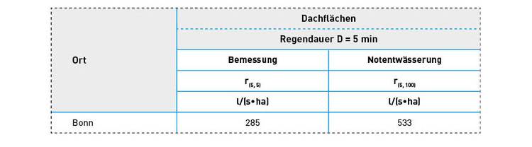 Dachentwässerungssysteme werden für r(5,5), das heißt ein am Gebäudestandort über fünf Minuten zu erwartendes Regenereignis – das alle fünf Jahre auftritt – bemessen.