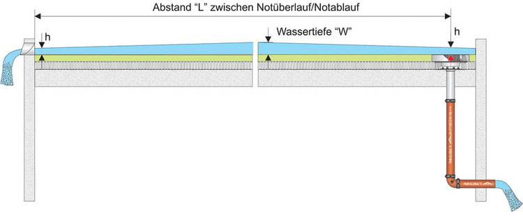 Nach DIN 1986-100, Abschnitt 14.2.6, gelten folgende Grundanforderungen an die Konstruktion von Notentwässerungen: „Die Addition der Druckhöhen am Dachablauf und an der Notentwässerung ergibt die maximale Überflutungshöhe auf dem Dach. Die maximale Überflutungshöhe auf dem Dach muss mit dem Tragwerksplaner (Statiker) abgestimmt werden.