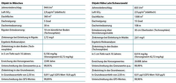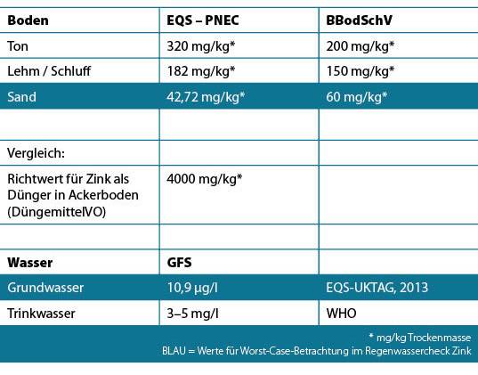 Für den Niederschlag, wie er aus den Wolken fällt, existieren keine Stoff-Qualitätsziele. Erst wenn der Regentropfen auf eine Fläche trifft, beginnt die Bilanzierung. Für sehr viele Baustoffe existieren Prüf-, Maßnahmen- und Vorsorgewerte für den Boden als auch Geringfügigkeitsschwellenwerte (GFS) für Gewässer. Werden z. B. Zinkionen von einer Dachfläche abgeschwemmt, gilt es, die Vorsorgewerte für den Boden dauerhaft nicht zu überschreiten. In Bezug auf Zink und auch Kupfer berücksichtigen die Vorsorgewerte immer auch eine in der Natur vorkommende Hintergrundkonzentration dieser Spurenelemente.