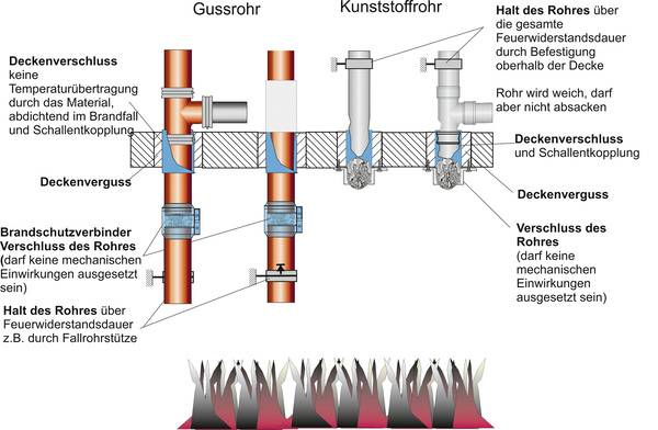 Dieser Punkt muss auch in die Überlegungen zum Schallschutz einbezogen werden. Es können hier keine losen Schellen verwendet werden, da das Rohr sicher gehalten werden muss, auch wenn das Rohr durch die Temperaturen aus dem Brandraum oberhalb der Decke weich wird und schmilzt. Als Folge daraus ist der Schallschutznachweis, sofern auf bestimmte Schellen verwiesen wird, meist kritisch zu sehen, zumindest sollte hier nachgefragt werden. Der Brandschutz hat hier oberste Priorität.