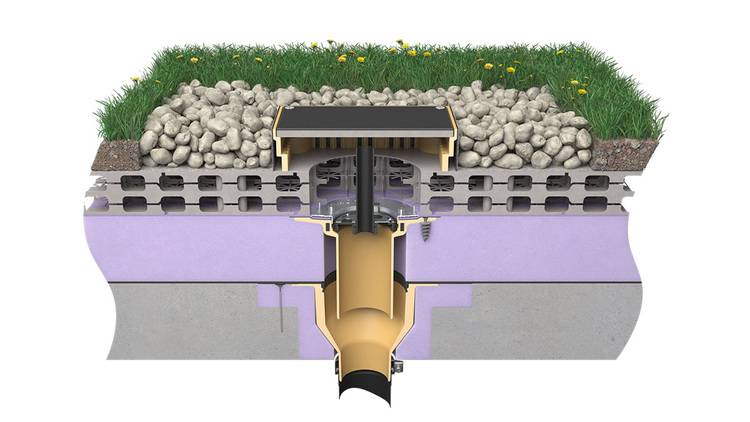 - Die untere Entwässerungsebene befindet sich direkt auf der Dachabdichtung und nicht, wie beim Warmdach, auf der Wärmedämmung. Auf dieser Ebene wird das wenigste Wasser abgeführt, primär das, was zwischen den Fugen der Wärmedämmung einsickert. Hier, also auf der Deckenkonstruktion, kommt der SitaStandard als Basisgully zum Einsatz. Das leistungsfähige, bewährte Bauteil nimmt dann auch die Regenspenden auf, die auf den folgenden Entwässerungsebenen auflaufen.