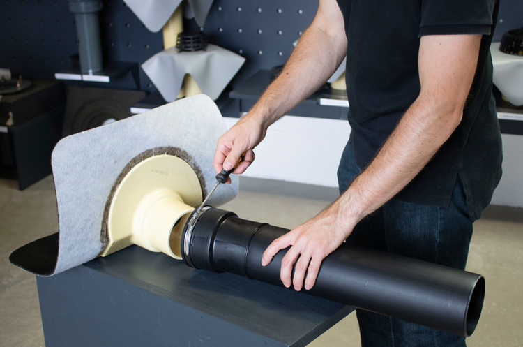 Das SitaMore PE-Anschlussrohr ist leicht zu montieren, und dies nicht nur wegen des im Vergleich zu Edelstahl geringeren Materialgewichtes. Hauptanwendungsbereich ist die Attika. Dehnungsfugen erleichtern das Einschieben des Gullystutzens in das Rohr. Aber sobald die Schlauchschelle fest angezogen ist, kann Gully und Rohr nichts mehr trennen – selbst kräftiges Ruckeln durch Handwerker, die auf der anderen Seite der Attika tätig werden. Auch thermisch bedingten Bauwerksbewegungen hält die Konstruktion stand.