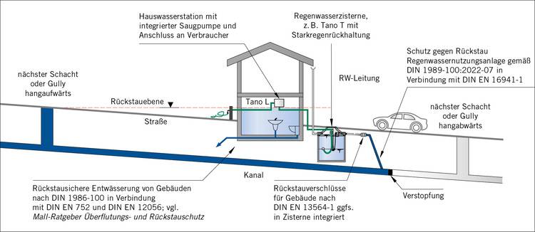 Wenn der Überlauf unterhalb der Rückstauebene liegt, fordern die in diesem Punkt gleich lautenden Normen DIN 1989‑100 und DIN 1986‑100 beim Ableiten von Regenwasser aus unterirdischen Speichern in den Regenwasserkanal einen der folgenden Rückstauverschlusstypen: