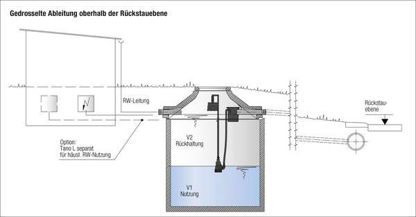In beiden Fällen, bei Anschluss des Regenwasserspeicherüberlaufs an den Regen- und an den Mischwasserkanal, können die genannten Rückstauverschlüsse in den Regenwasserspeicher integriert oder in einem separaten Schacht angeordnet werden [7].