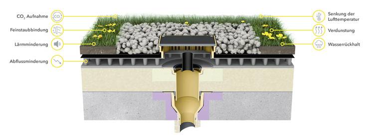 Einer der wichtigsten Faktoren ist das Porenvolumen. Eine begrünte speicherfähige Dachfläche hat ein anderes Porenvolumen als eine bekieste Dachfläche. Daraus lassen sich die Druckhöhen ermitteln, um die Retentionselemente festlegen zu können und auch die Dachgullys zu bestimmen. Letztendlich ist jedes Gründach in gewisser Weise ein Retentionsdach, aber bei einem Retentionsdach wird noch wesentlich mehr Wasser zurückgehalten.