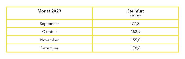 Diese Hypothese wurde näherer Betrachtung unterzogen, jedoch bei der Analyse der statistischen Regendaten/-mengen am Beispiel Steinfurt wieder verworfen. In den Sommermonaten könnte dieses Rechenexempel noch funktionieren, aber in den Herbst- und Wintermonaten nicht mehr. Die in diesem Zeitraum verzeichnete Monatssumme der Niederschlagshöhe in Millimeter (Bild D) würde dazu führen, dass die Dächer „überlaufen“ und versumpfen.