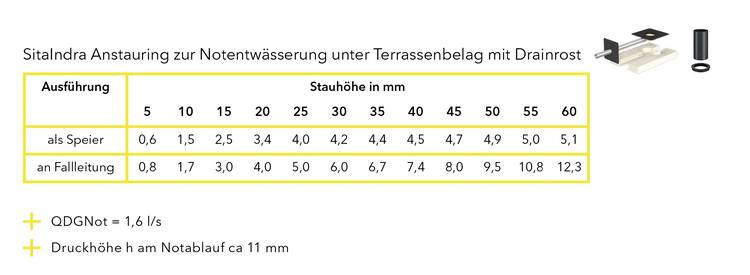 Entsprechend dem Rechenbeispiel darf der Drosselabfluss max. 1,0 l/s betragen, woraus sich ergibt, dass jeder Gully auf 0,33 l/s bei einer Stauhöhe/Wassersäule von 79 mm gedrosselt wird. Bei der Wahl des passenden Retentionsgullys helfen Tabellen und ein Berechnungsprogramm, ebenso wie der Berechnungsservice des Entwässerungsspezialisten, der projektbegleitend konsultiert werden kann. Dieser Service ist kostenlos, bringt Arbeitserleichterung und auch Rückendeckung bei der doch recht komplizierten Retentionsberechnung.