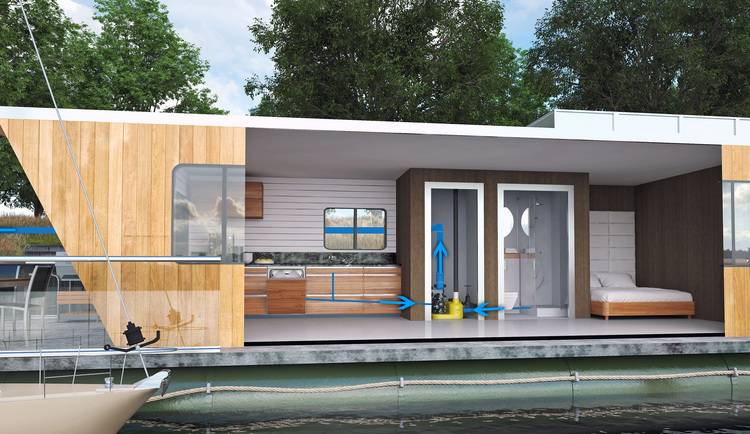 Auch auf dem Gebiet der Abwasserentsorgung von Hausbooten ist Jung Pumpen mit seinen Compli-Hebeanlagen aktiv und hat schon zahlreiche Objekte in den Niederlanden und Deutschland realisiert. Da hier kein Druckentwässerungsschacht installiert werden kann, wird das Abwasser innerhalb des Hausbootes in robusten PE-Behältern gesammelt und bei Erreichen eines vorgegebenen Füllstands mit einer starken Freistromrad-Pumpe an eine auf dem Festland befindliche Übergabestation übergeben. (Bild 5)