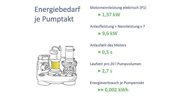 Berücksichtigt man die Förderleistung der Pumpe, stellt man fest, dass diese weniger als 3 s benötigt, um das Volumen zu entsorgen. Korrekterweise rechnet man zur Ermittlung des Energiebedarfs eines Hebevorgangs auch den Beitrag des hohen Anlaufstromes ein, der bei 24-maligem Einschalten nicht vernachlässigt werden darf.