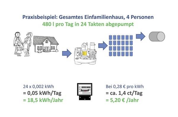 Die Grafik zeigt, dass die Hebeanlage diese Abwassermenge pro Tag in 24 Portionen à 20 Liter etwa 3 m hochhebt und zum Kanal befördert.