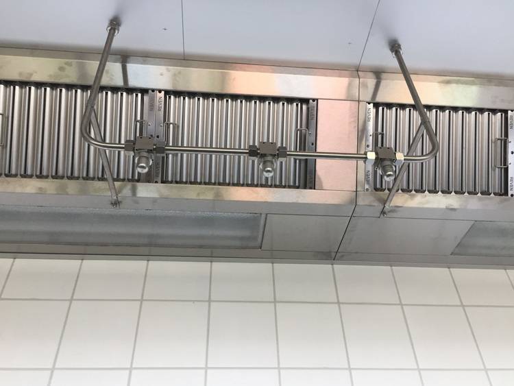 Das Protect-System von Reven schaltet mit dem Löschvorgang die Kochgeräte strom- bzw. gaslos. Die Technik ist nachrüstbar. Je nach Größe der Küche und deren Abzugsanlage werden fünf bis 20 Löschdüsen auf „Löschbrücken“ über dem Herdblock installiert (siehe Bilder unten). Besprüht wird im Brandfall auch der Abluftbereich hinter den Fettabscheidern, um eine Brandübertragung auf angrenzende Gebäudezonen zu verhindern.