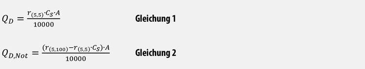 Die Berechnung der Regenwassermengen QD und QD,Not für die Regel- und Notentwässerung erfolgt nach den Gleichungen (1) bzw. (2). Dies gilt für frei bewitterte Flächen wie Dächer und Dachterrassen.